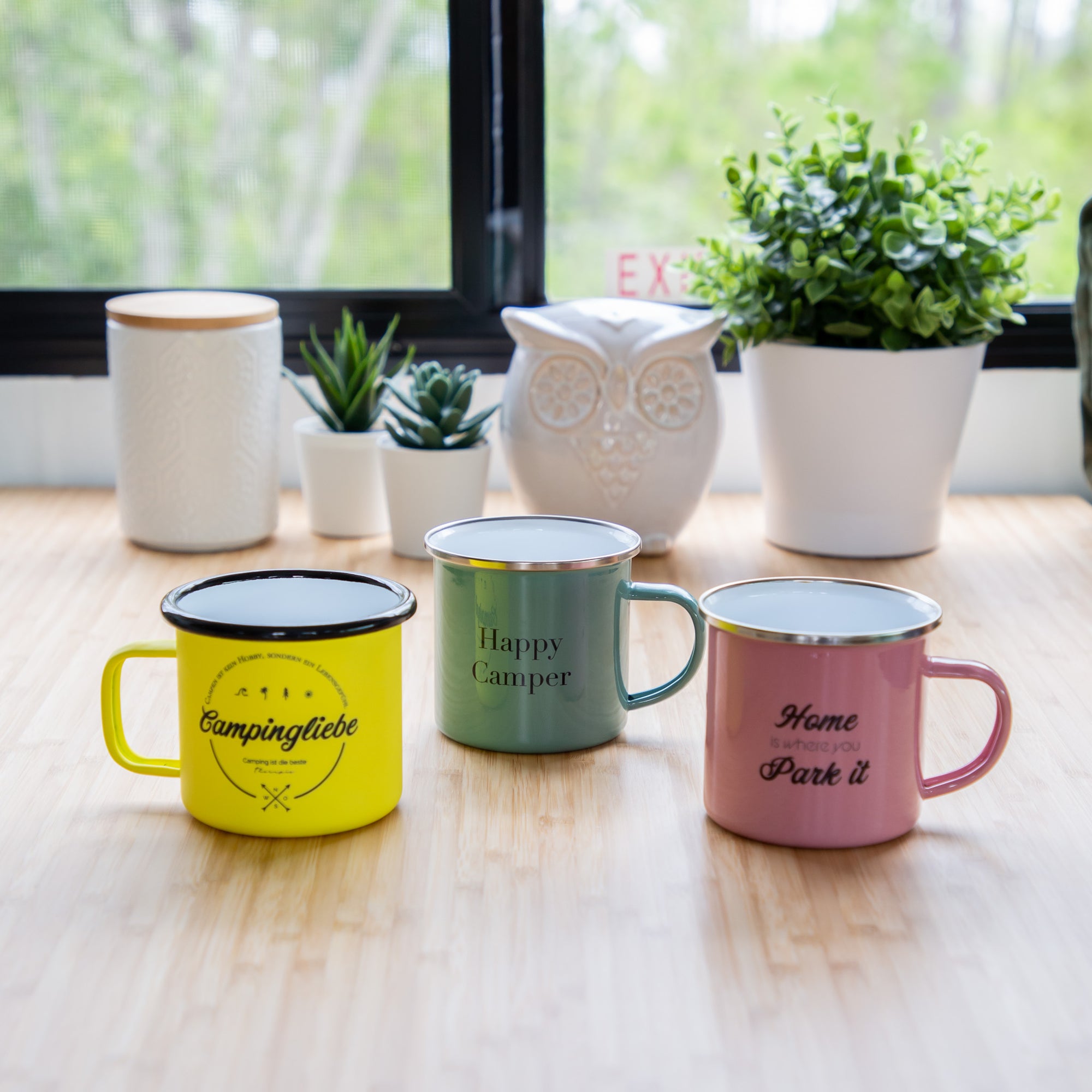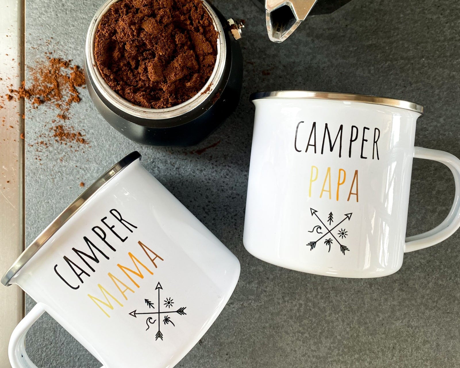 Lange gesucht und nun exklusiv für Dich gefunden: bunte Emaille-Tassen. Mit unseren eigenen Designs versehen sind sie ein ganz besonderer Hingucken auf Deinem Campingtisch.